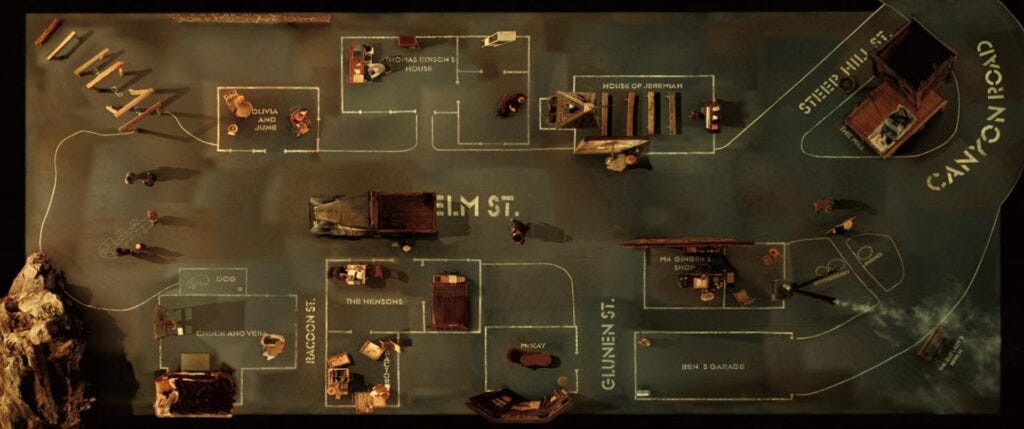 La strada per l’inferno è lastricata - Un altro film che mi è piaciuto moltissimo, per motivi completamente diversi, è Dogville di Las von Trier. Racconta di una ragazza in fuga da una banda di criminali, che trova rifugio in un paesino (Dogville, appunto) nel mezzo delle montagne rocciose. Per sdebitarsi dell’accoglienza offre il suo aiuto nelle attività quotidiane, ma questo aiuto, pian piano, diventa sempre meno volontario. Il film è un accumulo sempre più pesante e disturbante, con violenze sessuali, psicologiche e fisiche, e sempre meno fiducia nell’altro. Non un film leggero (ma neanche il più pesante di von Trier, da quello che mi dicono), ma comunque incredibile. Tocco finale: il film si svolge in questa specie di palco, che rappresenta la città, dove quasi tutti gli elementi che non siano esseri umani o mobili sono rappresentati semplicemente con delle linee di gesso per terra, come su una cartina, contribuendo al senso di estraniamento.